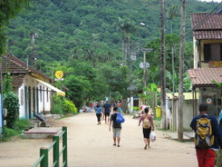 The only way to get to the island Ilha Grande is with the ferry that is moored in the small harbor of Vila do Abraao. A picturesque village with palm trees, lovely little houses and a snow-white church. Only the harbor front and the main street are tiled with cobblestones, but just outside the center is sand and gravel.