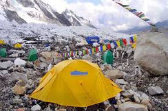 There is a lot of wind here and we see a number of colored tents criss-cross on a rocky terrain. Further on are some larger tents where people apparently eat and are during the day. The people who camp here will stay here for a few days on average to acclimatize.