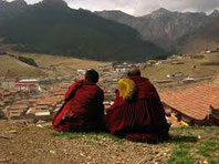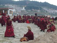 A granny comes running up and gives a touch to every golden prayer wheel that hangs under a small roof. They are building a lot in the village, when I walk to the other side to climb a steep slope. On this hill there are some Tibetan prayer flags with thousands of Tibetan lucky letters on the ropes. On the top I am sitting down in the grass enjoying the view when I suddenly hear hands clapping and loud talking. When I look down, at the square of the second monastery, I know what’s happening there but only because I experienced this before at a Buddhist monastery.