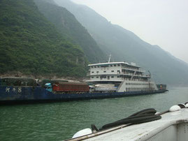 I read in my travel guide that the start of this 7-hour boat trip is not really exciting and I decide to catch up some sleep. The TV’s are roaring and most Chinese people are more interested in what it has to offer than the mysterious cliffs that pass by outside. Between the two rooms with seats is a kind of hall where the engine is situated and it’s possible to look directly to the cliffs outside. You stand here sheltered from the wind, and since I'm tall enough to look over the motor, you’ve got a beautiful view of the banks and the river that has been used for transport for years.