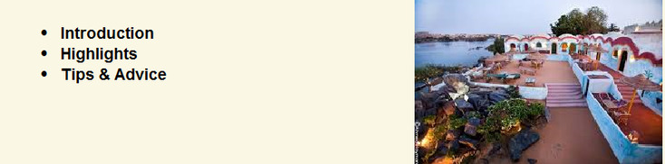 The southern part of the island is occupied by the ruins of Yebu. Besides the archaeological sites, the island is now used by the Aswan Museum in the south, the local population in three villages in the middle of the island and a large luxurious hotel on the other. The Nubian villages Siou and Koti are also worth a visit. There is an old Nilometer to measure the height of a flood. You can go to the island with a felucca but you can also take the public ferry (0.25 EL).