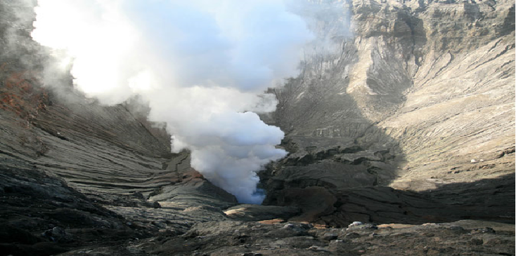 It is about a half hour drive when we stop on the mountain Pananjakan. Here is a whole row of jeeps waiting. Suddenly we see a small glittering sphere looming; the sun rises and we have a beautiful panorama over the Bromo volcano with the rising sun behind it. It looks like a lunar landscape that is becoming increasingly visible with the increasingly brighter light. Bromo, which is the first volcanic mouth with its 2392 meters of altitude that we see seems to me rather like a tree stump.