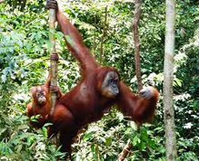The men I'm talking to have been on a junge tour yesterday and it's clear that I'm going with a Danish couple including two guides. Around nine o'clock I say goodbye to the other tourists and we leave. I tie up my trouser-ziplegs with elastic and long sleeves. It’s full with mosquitoes with this damped heat and despite the heat and humidity this is highly recommended. We are not even half an hour away or we see our first orang-utan hanging in the tree with a youngster. The guides make it clear that the entire orang-utan-shelter has been washed away and that the animals do not know where they have to go to eat at the moment and whether if they get any.