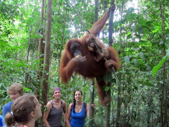 We leave the mother orang-utan behind us while she follows us all the way in the hope we have food wit hus. At the sam time we see and hear some gibbon monkeys in the distance. Suddenly we walk straight through an ant-trail and the guides call very hard "antz" on which we all start to stamp on the ground with our feet and go through as quickly as possible.