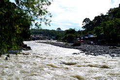 The minibus drives a circle about what was once most probably the lively center of this once so touristy village in the middle of the Gunung Lenger park. People point to a building on the other side of the swirling river - that must be a place where I can sleep. I get out and look around, I can’t hardly believe it. First I have to sit in a small boat looking more like a raft to the other side. There is a rope stretched between the two sides. You have to make yourself small on top of your bag and hope for the best. After a few minutes I set foot on a narrow island on which a kind of bungalow park has been laid out.