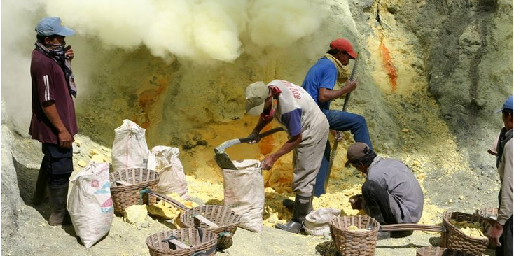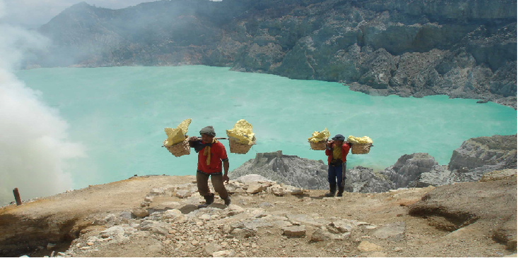 The sulfur is melted in a mold and guided to the outside via ceramic pipes. There it solidifies and forms a yellow mass that is chopped into pieces and carried down on the shoulder in wicker baskets. Although it looks like yellow styrofoam, this weighs on average 90 kilograms. It is a walk of about two and a half hours. One runs an average of 2 times a day and gets paid per kilo which comes down to € 5 per catch.