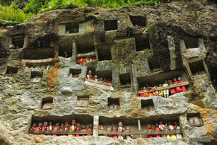 About 10 kilometers south of Rantepao lies the town of Lemo; this is probably the best place to see the unique Tau-Tau dolls. In the steep rocks in the village there are several series of death-dolls on so-called balconies. It is just in the Toraja culture that people make a doll after the death of a person and to show it to the deceased. The soul would live on like this. The largest balcony here has no less than 12 Tau-Tau dolls, often representing a family. In Londa, which lies between Rantepao and Lemo, there is still an even more extensive balcony with the same Tau-Tau dolls. There is also a cave full of skulls and bones to see here half in coffins. A lugubrious but also unique image.