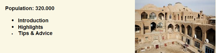 The city became known at that time for its pottery, textile and tiles. Despite a terrible earthquake, the conservative city has been rebuilt again and is now famous for its relaxed atmosphere, its lovely big bazaar and the beautifully renovated traditional houses; you can also enjoy the Fin gardens and the great mosque.