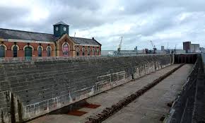 On the square behind it the Ttianic and his sister Olympic were actually built. By using solid lines on the surface and metal poles you can get an idea of the actual dimensions and details of the ship. At the very back of the harbor you can see the old HMS Caroline ship from 1914 (WWI) - it is unfortunately not to be visited. Here is also the original pumphouse and the world's largest dry dock (see below). Next to it are the huge immense harbor cranes Samson and Goliath, owned by the shipbuilders Harland & Wolff.