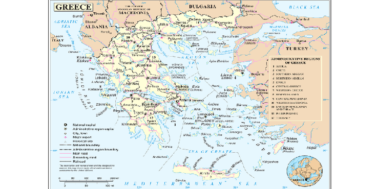 Griekenland grenst in het noorden (van west naar oost) aan Albanië, Macedonië, Bulgarije en Turkije. Voor het overige is het vasteland van Griekenland omgeven door de Middellandse Zee (in het zuiden), de Ionische Zee (in het westen) en de Egeïsche Zee (in het oosten). De grootste eilanden zijn Kreta, Euboea, Lesbos en Rodos.