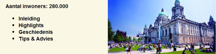 Niet zo opmerkelijk dat Belfast ooit een grote scheepsbouwindustrie had – de Titanic is hier gebouwd. De stad is vrij nieuw al heeft het desalniettemin een aantal aansprekende gebouwen. Belfast wordt omringd door heuvels.