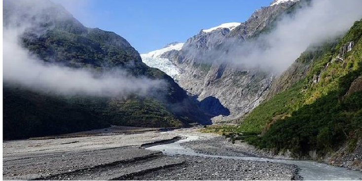 Onderweg in het busje – de gletsjer ligt ongeveer 5 km ten zuiden van het dorpje – wordt ons nog gewezen op de Waiho rivier wiens water van de gletsjer afkomt. De gletsjer werd in de 20ste eeuw steeds korter maar groeide gelukkig weer in de jaren 80 van de vorige eeuw – bijna 2 km, als een van de weinige in Nieuw-Zeeland. Helaas krimpt hij weer in de 21ste eeuw.
