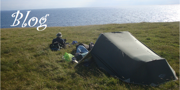 De zon schijnt en nadat het later is geworden en de meeste toeristen huiswaarts zijn gekeerd zetten wij op het grasveld onze tenten op en door de wind is het aantal midgies hier minimaal.